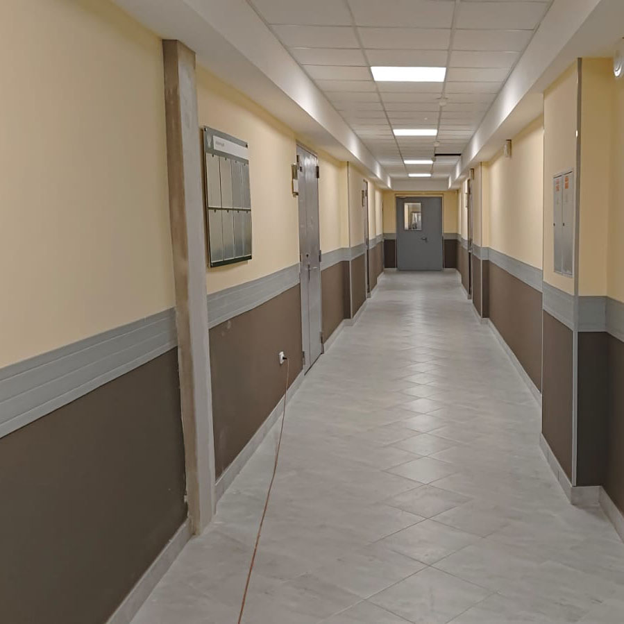 Вторым уровнем, на высоте 70-100 см, монтируется отбойная доска ПВХ, защищая поверхность стен от ручек открывающихся дверей, каталок, спинок стульев и столешниц и т.д. На лестничных маршах устанавливается отбойная доска только на втором уровне.