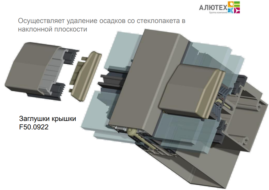 Устанавливается на торцы профиля прижимной планки и крышки. Предназначен для отвода влаги с наружной поверхности стеклопакета в наклонных конструкциях.