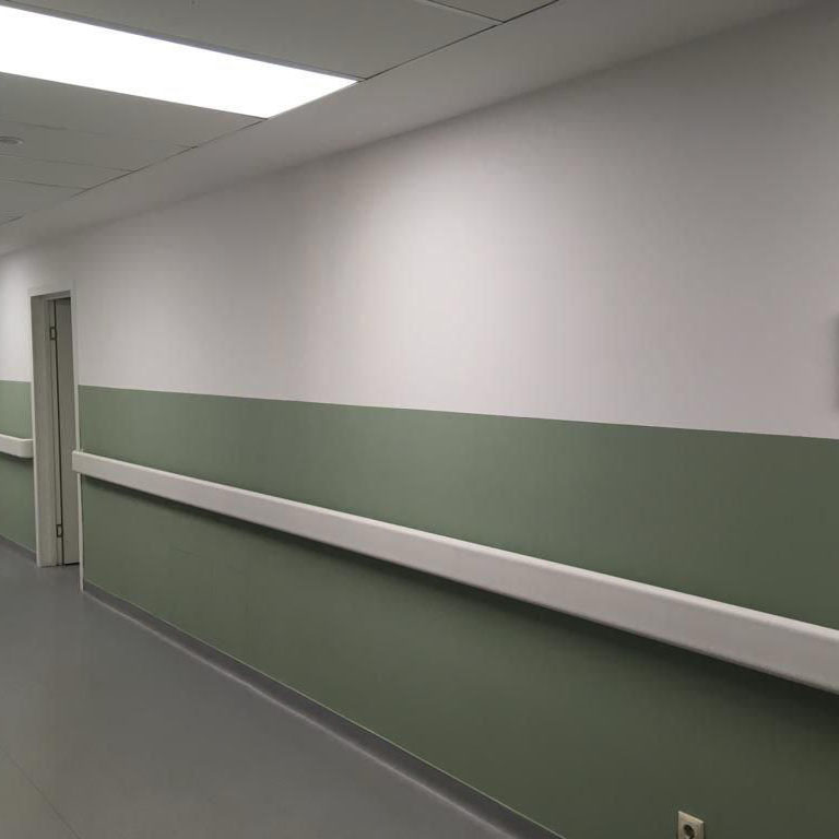 Конструкция отбойника-поручня состоит из прочного алюминиевого профиля, износостойкого винилового кожуха и резинового уплотнителя, который эффективно амортизирует удары каталок, тележек и медицинского оборудования.