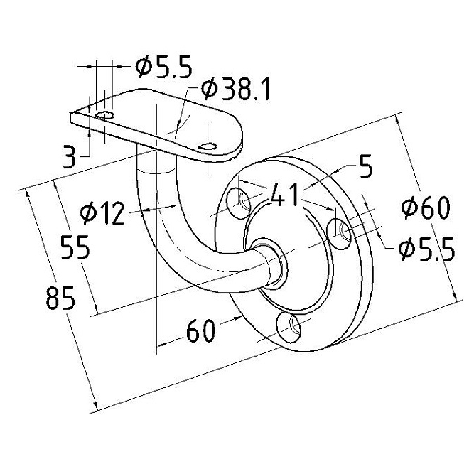 Габариты: под поручень Ø38.1, вынос 70х45, Ø60х3 мм, литой, 25х45х2 мм